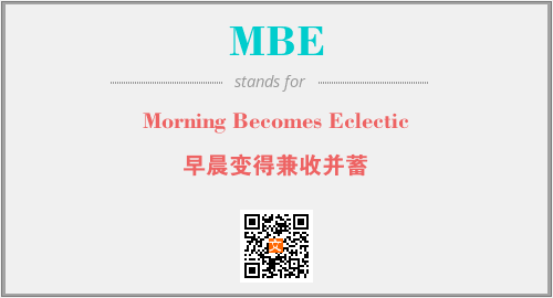 上述内容是“Morning Becomes Eclectic”作为“MBE”的缩写,解释为“早晨变得兼收并蓄”时的信息,以及英文缩略词MBE所代表的英文单词,其对应的中文拼音、详细解释以及在英文中的流行度和相关分类、应用领域及应用示例等。