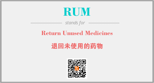 上述内容是“Return Unused Medicines”作为“RUM”的缩写,解释为“退回未使用的药物”时的信息,以及英文缩略词RUM所代表的英文单词,其对应的中文拼音、详细解释以及在英文中的流行度和相关分类、应用领域及应用示例等。
