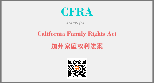 上述内容是“California Family Rights Act”作为“CFRA”的缩写,解释为“加州家庭权利法案”时的信息,以及英文缩略词CFRA所代表的英文单词,其对应的中文拼音、详细解释以及在英文中的流行度和相关分类、应用领域及应用示例等。
