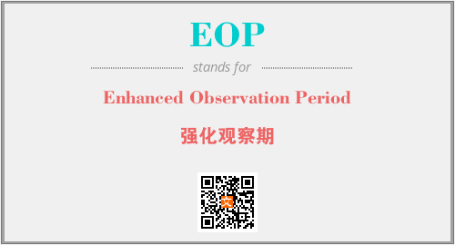 英文缩略词“EOP”经常作为“Enhanced Observation Period”的英文缩写来使用,中文表示:“强化观察期”。本文将详细介绍英文缩写词EOP所代表英文单词,其对应的中文拼音、详细解释以及在英语中的流行度。此外,还有关于缩略词EOP的分类、应用领域及相关应用示例等。