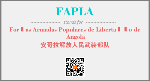 英文缩略词“FAPLA”经常作为“Forças Armadas Populares de Libertação de Angola”的英文缩写来使用,中文表示:“安哥拉解放人民武装部队”。本文将详细介绍英文缩写词FAPLA所代表英文单词,其对应的中文拼音、详细解释以及在英语中的流行度。此外,还有关于缩略词FAPLA的分类、应用领域及相关应用示例等。