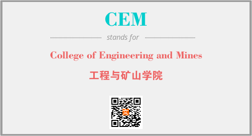 上述内容是“College of Engineering and Mines”作为“CEM”的缩写,解释为“工程与矿山学院”时的信息,以及英文缩略词CEM所代表的英文单词,其对应的中文拼音、详细解释以及在英文中的流行度和相关分类、应用领域及应用示例等。