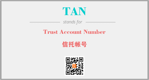 英文缩略词“TAN”经常作为“Trust Account Number”的英文缩写来使用,中文表示:“信托帐号”。本文将详细介绍英文缩写词TAN所代表英文单词,其对应的中文拼音、详细解释以及在英语中的流行度。此外,还有关于缩略词TAN的分类、应用领域及相关应用示例等。