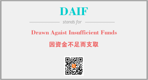 上述内容是“Drawn Agaist Insufficient Funds”作为“DAIF”的缩写,解释为“因资金不足而支取”时的信息,以及英文缩略词DAIF所代表的英文单词,其对应的中文拼音、详细解释以及在英文中的流行度和相关分类、应用领域及应用示例等。