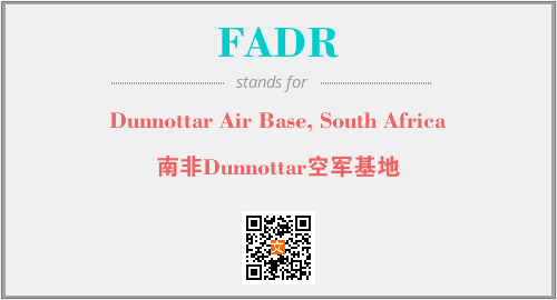 英文缩略词“FADR”经常作为“Dunnottar Air Base, South Africa”的英文缩写来使用,中文表示:“南非Dunnottar空军基地”。本文将详细介绍英文缩写词FADR所代表英文单词,其对应的中文拼音、详细解释以及在英语中的流行度。此外,还有关于缩略词FADR的分类、应用领域及相关应用示例等。