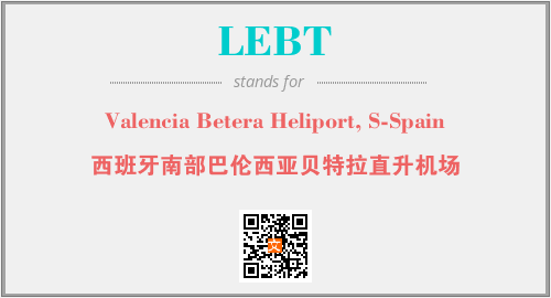 英文缩略词“LEBT”经常作为“Valencia Betera Heliport, S-Spain”的英文缩写来使用,中文表示:“西班牙南部巴伦西亚贝特拉直升机场”。本文将详细介绍英文缩写词LEBT所代表英文单词,其对应的中文拼音、详细解释以及在英语中的流行度。此外,还有关于缩略词LEBT的分类、应用领域及相关应用示例等。