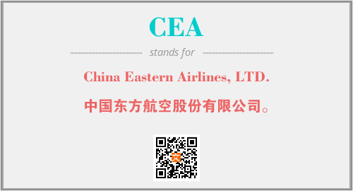 上述内容是“China Eastern Airlines, LTD.”作为“CEA”的缩写,解释为“中国东方航空股份有限公司。”时的信息,以及英文缩略词CEA所代表的英文单词,其对应的中文拼音、详细解释以及在英文中的流行度和相关分类、应用领域及应用示例等。