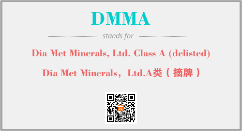 上述内容是“Dia Met Minerals, Ltd. Class A (delisted)”作为“DMMA”的缩写,解释为“Dia Met Minerals,Ltd.A类(摘牌)”时的信息,以及英文缩略词DMMA所代表的英文单词,其对应的中文拼音、详细解释以及在英文中的流行度和相关分类、应用领域及应用示例等。
