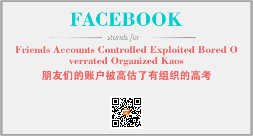 以上为Friends Accounts Controlled Exploited Bored Overrated Organized Kaos英文缩略词FACEBOOK的中文解释,以及该英文缩写在英语的流行度、分类和应用领域方面的信息。