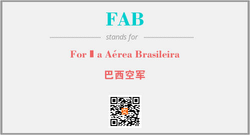 上述内容是“Força Aérea Brasileira”作为“FAB”的缩写,解释为“巴西空军”时的信息,以及英文缩略词FAB所代表的英文单词,其对应的中文拼音、详细解释以及在英文中的流行度和相关分类、应用领域及应用示例等。