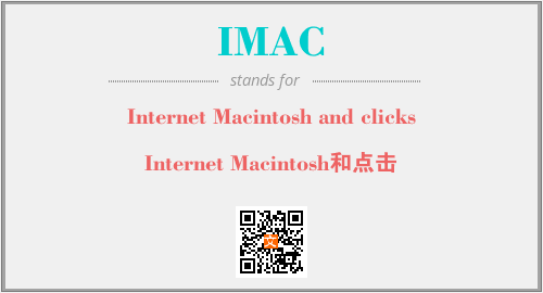 上述内容是“Internet Macintosh and clicks”作为“IMAC”的缩写,解释为“Internet Macintosh和点击”时的信息,以及英文缩略词IMAC所代表的英文单词,其对应的中文拼音、详细解释以及在英文中的流行度和相关分类、应用领域及应用示例等。