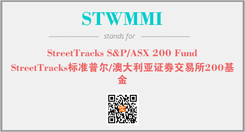 上述内容是“StreetTracks S&P/ASX 200 Fund”作为“STWMMI”的缩写,解释为“StreetTracks标准普尔/澳大利亚证券交易所200基金”时的信息,以及英文缩略词STWMMI所代表的英文单词,其对应的中文拼音、详细解释以及在英文中的流行度和相关分类、应用领域及应用示例等。