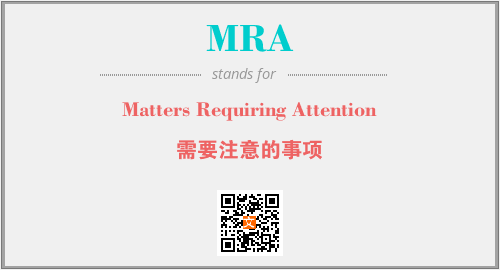 以上为Matters Requiring Attention英文缩略词MRA的中文解释,以及该英文缩写在英语的流行度、分类和应用领域方面的信息。