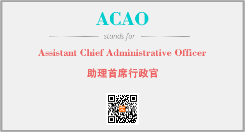 英文缩略词“ACAO”经常作为“Assistant Chief Administrative Officer”的英文缩写来使用,中文表示:“助理首席行政官”。本文将详细介绍英文缩写词ACAO所代表英文单词,其对应的中文拼音、详细解释以及在英语中的流行度。此外,还有关于缩略词ACAO的分类、应用领域及相关应用示例等。