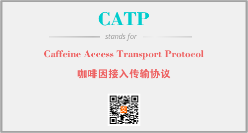 上述内容是“Caffeine Access Transport Protocol”作为“CATP”的缩写,解释为“咖啡因接入传输协议”时的信息,以及英文缩略词CATP所代表的英文单词,其对应的中文拼音、详细解释以及在英文中的流行度和相关分类、应用领域及应用示例等。