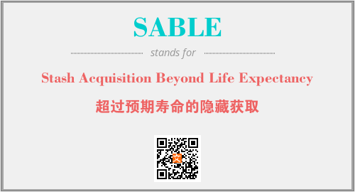 上述内容是“Stash Acquisition Beyond Life Expectancy”作为“SABLE”的缩写,解释为“超过预期寿命的隐藏获取”时的信息,以及英文缩略词SABLE所代表的英文单词,其对应的中文拼音、详细解释以及在英文中的流行度和相关分类、应用领域及应用示例等。