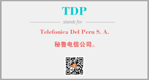 上述内容是“Telefonica Del Peru S. A.”作为“TDP”的缩写,解释为“秘鲁电信公司。”时的信息,以及英文缩略词TDP所代表的英文单词,其对应的中文拼音、详细解释以及在英文中的流行度和相关分类、应用领域及应用示例等。
