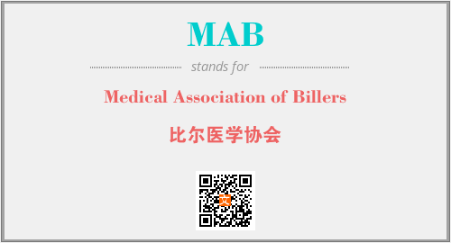 上述内容是“Medical Association of Billers”作为“MAB”的缩写,解释为“比尔医学协会”时的信息,以及英文缩略词MAB所代表的英文单词,其对应的中文拼音、详细解释以及在英文中的流行度和相关分类、应用领域及应用示例等。