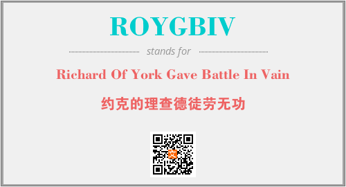 上述内容是“Richard Of York Gave Battle In Vain”作为“ROYGBIV”的缩写,解释为“约克的理查德徒劳无功”时的信息,以及英文缩略词ROYGBIV所代表的英文单词,其对应的中文拼音、详细解释以及在英文中的流行度和相关分类、应用领域及应用示例等。