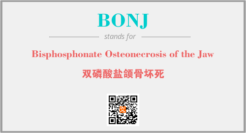 上述内容是“Bisphosphonate Osteonecrosis of the Jaw”作为“BONJ”的缩写,解释为“双磷酸盐颌骨坏死”时的信息,以及英文缩略词BONJ所代表的英文单词,其对应的中文拼音、详细解释以及在英文中的流行度和相关分类、应用领域及应用示例等。