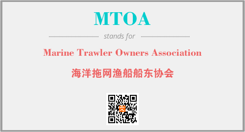 上述内容是“Marine Trawler Owners Association”作为“MTOA”的缩写,解释为“海洋拖网渔船船东协会”时的信息,以及英文缩略词MTOA所代表的英文单词,其对应的中文拼音、详细解释以及在英文中的流行度和相关分类、应用领域及应用示例等。