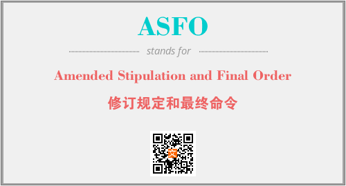 上述内容是“Amended Stipulation and Final Order”作为“ASFO”的缩写,解释为“修订规定和最终命令”时的信息,以及英文缩略词ASFO所代表的英文单词,其对应的中文拼音、详细解释以及在英文中的流行度和相关分类、应用领域及应用示例等。