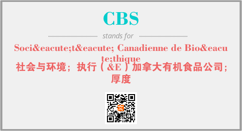 上述内容是“Société Canadienne de Bioéthique”作为“CBS”的缩写,解释为“社会与环境;执行(&E)加拿大有机食品公司;厚度”时的信息,以及英文缩略词CBS所代表的英文单词,其对应的中文拼音、详细解释以及在英文中的流行度和相关分类、应用领域及应用示例等。