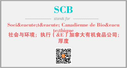 上述内容是“Société Canadienne de Bioéthique”作为“SCB”的缩写,解释为“社会与环境;执行(&E)加拿大有机食品公司;厚度”时的信息,以及英文缩略词SCB所代表的英文单词,其对应的中文拼音、详细解释以及在英文中的流行度和相关分类、应用领域及应用示例等。