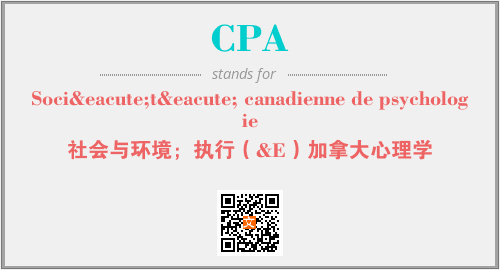 上述内容是“Société canadienne de psychologie”作为“CPA”的缩写,解释为“社会与环境;执行(&E)加拿大心理学”时的信息,以及英文缩略词CPA所代表的英文单词,其对应的中文拼音、详细解释以及在英文中的流行度和相关分类、应用领域及应用示例等。