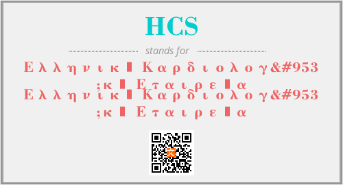 英文缩略词“HCS”经常作为“Ελληνική Καρδιολογική Εταιρεία”的英文缩写来使用,中文表示:“Ελληνική Καρδιολογική Εταιρεία”。本文将详细介绍英文缩写词HCS所代表英文单词,其对应的中文拼音、详细解释以及在英语中的流行度。此外,还有关于缩略词HCS的分类、应用领域及相关应用示例等。