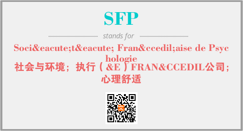 上述内容是“Société Française de Psychologie”作为“SFP”的缩写,解释为“社会与环境;执行(&E)FRAN&CCEDIL公司;心理舒适”时的信息,以及英文缩略词SFP所代表的英文单词,其对应的中文拼音、详细解释以及在英文中的流行度和相关分类、应用领域及应用示例等。