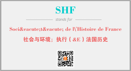 上述内容是“Société de l\'Histoire de France”作为“SHF”的缩写,解释为“社会与环境;执行(&E)法国历史”时的信息,以及英文缩略词SHF所代表的英文单词,其对应的中文拼音、详细解释以及在英文中的流行度和相关分类、应用领域及应用示例等。