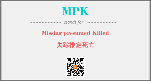 以上为Missing presumed Killed英文缩略词MPK的中文解释,以及该英文缩写在英语的流行度、分类和应用领域方面的信息。