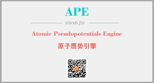 上述内容是“Atomic Pseudopotentials Engine”作为“APE”的缩写,解释为“原子赝势引擎”时的信息,以及英文缩略词APE所代表的英文单词,其对应的中文拼音、详细解释以及在英文中的流行度和相关分类、应用领域及应用示例等。