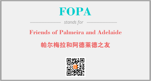 上述内容是“Friends of Palmeira and Adelaide”作为“FOPA”的缩写,解释为“帕尔梅拉和阿德莱德之友”时的信息,以及英文缩略词FOPA所代表的英文单词,其对应的中文拼音、详细解释以及在英文中的流行度和相关分类、应用领域及应用示例等。