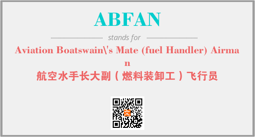 上述内容是“Aviation Boatswain\'s Mate (fuel Handler) Airman”作为“ABFAN”的缩写,解释为“航空水手长大副(燃料装卸工)飞行员”时的信息,以及英文缩略词ABFAN所代表的英文单词,其对应的中文拼音、详细解释以及在英文中的流行度和相关分类、应用领域及应用示例等。