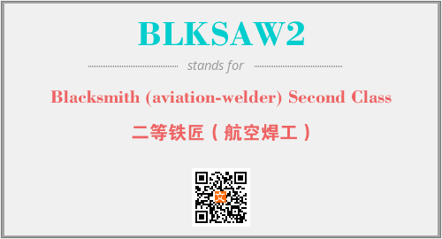英文缩略词“BLKSAW2”经常作为“Blacksmith (aviation-welder) Second Class”的英文缩写来使用,中文表示:“二等铁匠(航空焊工)”。本文将详细介绍英文缩写词BLKSAW2所代表英文单词,其对应的中文拼音、详细解释以及在英语中的流行度。此外,还有关于缩略词BLKSAW2的分类、应用领域及相关应用示例等。