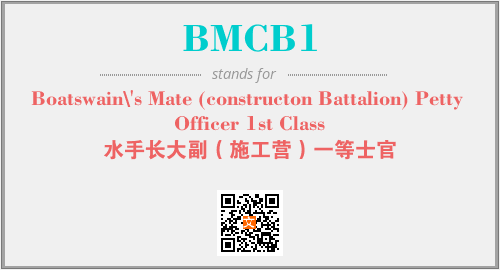 上述内容是“Boatswain\'s Mate (constructon Battalion) Petty Officer 1st Class”作为“BMCB1”的缩写,解释为“水手长大副(施工营)一等士官”时的信息,以及英文缩略词BMCB1所代表的英文单词,其对应的中文拼音、详细解释以及在英文中的流行度和相关分类、应用领域及应用示例等。