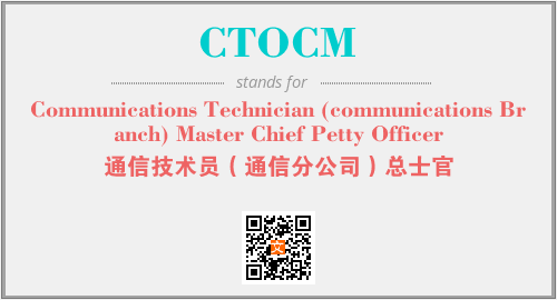 英文缩略词“CTOCM”经常作为“Communications Technician (communications Branch) Master Chief Petty Officer”的英文缩写来使用,中文表示:“通信技术员(通信分公司)总士官”。本文将详细介绍英文缩写词CTOCM所代表英文单词,其对应的中文拼音、详细解释以及在英语中的流行度。此外,还有关于缩略词CTOCM的分类、应用领域及相关应用示例等。