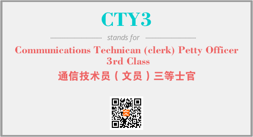 英文缩略词“CTY3”经常作为“Communications Technican (clerk) Petty Officer 3rd Class”的英文缩写来使用,中文表示:“通信技术员(文员)三等士官”。本文将详细介绍英文缩写词CTY3所代表英文单词,其对应的中文拼音、详细解释以及在英语中的流行度。此外,还有关于缩略词CTY3的分类、应用领域及相关应用示例等。