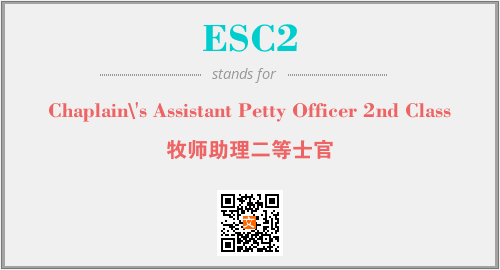 上述内容是“Chaplain\'s Assistant Petty Officer 2nd Class”作为“ESC2”的缩写,解释为“牧师助理二等士官”时的信息,以及英文缩略词ESC2所代表的英文单词,其对应的中文拼音、详细解释以及在英文中的流行度和相关分类、应用领域及应用示例等。