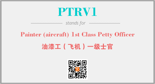 上述内容是“Painter (aircraft) 1st Class Petty Officer”作为“PTRV1”的缩写,解释为“油漆工(飞机)一级士官”时的信息,以及英文缩略词PTRV1所代表的英文单词,其对应的中文拼音、详细解释以及在英文中的流行度和相关分类、应用领域及应用示例等。