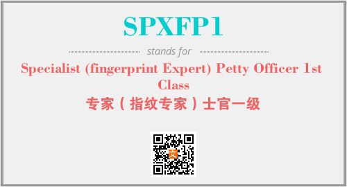 英文缩略词“SPXFP1”经常作为“Specialist (fingerprint Expert) Petty Officer 1st Class”的英文缩写来使用,中文表示:“专家(指纹专家)士官一级”。本文将详细介绍英文缩写词SPXFP1所代表英文单词,其对应的中文拼音、详细解释以及在英语中的流行度。此外,还有关于缩略词SPXFP1的分类、应用领域及相关应用示例等。