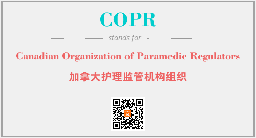 上述内容是“Canadian Organization of Paramedic Regulators”作为“COPR”的缩写,解释为“加拿大护理监管机构组织”时的信息,以及英文缩略词COPR所代表的英文单词,其对应的中文拼音、详细解释以及在英文中的流行度和相关分类、应用领域及应用示例等。