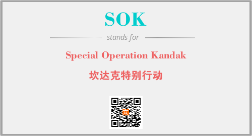 上述内容是“Special Operation Kandak”作为“SOK”的缩写,解释为“坎达克特别行动”时的信息,以及英文缩略词SOK所代表的英文单词,其对应的中文拼音、详细解释以及在英文中的流行度和相关分类、应用领域及应用示例等。