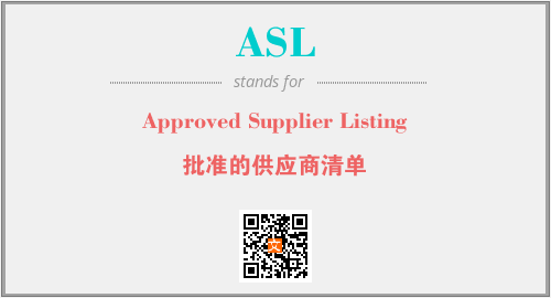 英文缩略词“ASL”经常作为“Approved Supplier Listing”的英文缩写来使用,中文表示:“批准的供应商清单”。本文将详细介绍英文缩写词ASL所代表英文单词,其对应的中文拼音、详细解释以及在英语中的流行度。此外,还有关于缩略词ASL的分类、应用领域及相关应用示例等。