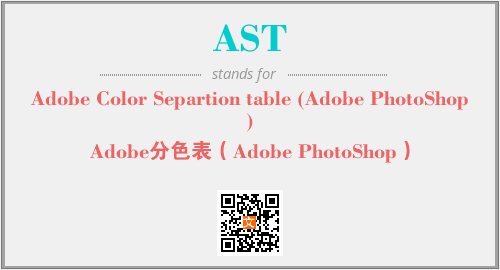 上述内容是“Adobe Color Separtion table (Adobe PhotoShop)”作为“AST”的缩写,解释为“Adobe分色表(Adobe PhotoShop)”时的信息,以及英文缩略词AST所代表的英文单词,其对应的中文拼音、详细解释以及在英文中的流行度和相关分类、应用领域及应用示例等。