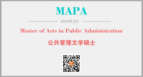 上述内容是“Master of Arts in Public Administration”作为“MAPA”的缩写,解释为“公共管理文学硕士”时的信息,以及英文缩略词MAPA所代表的英文单词,其对应的中文拼音、详细解释以及在英文中的流行度和相关分类、应用领域及应用示例等。