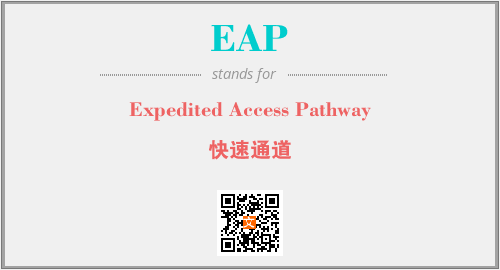 英文缩略词“EAP”经常作为“Expedited Access Pathway”的英文缩写来使用,中文表示:“快速通道”。本文将详细介绍英文缩写词EAP所代表英文单词,其对应的中文拼音、详细解释以及在英语中的流行度。此外,还有关于缩略词EAP的分类、应用领域及相关应用示例等。