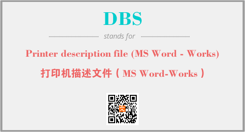 英文缩略词“DBS”经常作为“Printer description file (MS Word - Works)”的英文缩写来使用,中文表示:“打印机描述文件(MS Word-Works)”。本文将详细介绍英文缩写词DBS所代表英文单词,其对应的中文拼音、详细解释以及在英语中的流行度。此外,还有关于缩略词DBS的分类、应用领域及相关应用示例等。